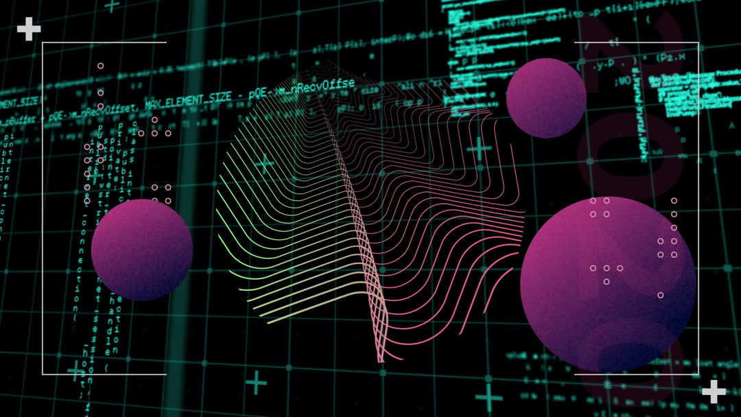 Abstract digital artwork featuring floating circles and wavy lines superimposed over a grid with programming scripts. This stylish composition combines elements of technology and abstract art, making it ideal for presentations on cutting-edge technological advancements, cybersecurity visuals, or as a dynamic background for tech-related content.