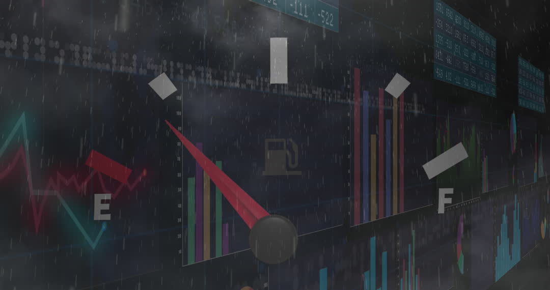 Abstract visualization combining automobile engineering and business data showcasing statistical graphs with an animated speedometer against a rainy and clouded sky. This video is ideal for presentations or articles related to technological innovation, data analysis, and engineering trends.