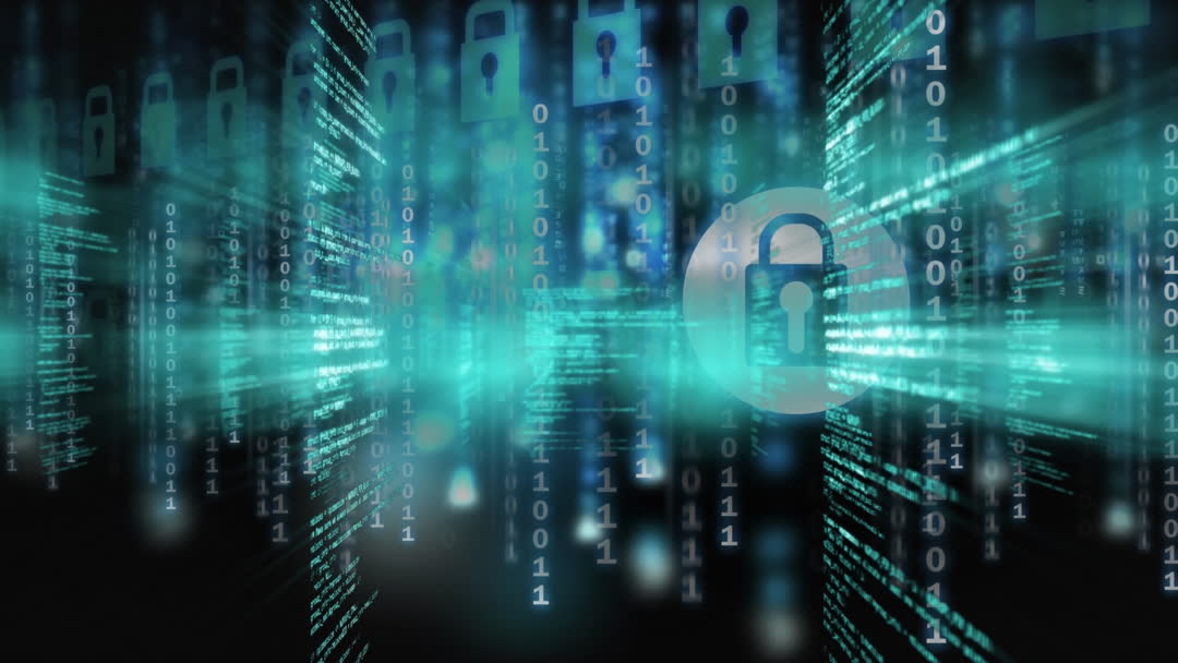 This abstract visual depicts a digital landscape with binary code and encryption icons against a dark backdrop, symbolizing cybersecurity and data processing. The motion of data streams suggests digital connectivity. Ideal for use in presentations or media discussing cybersecurity, data protection, or IT themes.