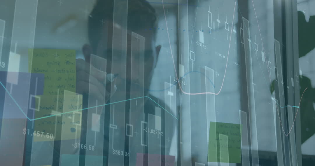 Abstract representation of data processing with overlaid statistical charts and graphs. The video is useful for illustrating concepts related to finance, business analytics, digital transformation, and the impact of global events like the COVID-19 pandemic on economics. Ideal for use in presentations, articles, and reports focused on data-driven decision making and advanced analytics.