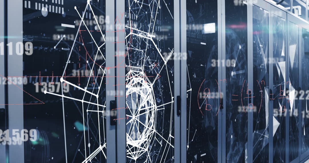 This abstract illustration showcases an interconnected web of data within computer servers, emphasizing data processing in a global computing environment. The digital interface style and geometric network connections suggest advanced technology concepts, ideal for use in articles, presentations, or media related to IT infrastructure and data centers.