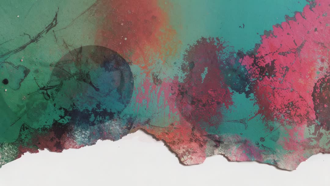 AI Generated Image. Loopable abstract watercolor clip showing torn paper edge revealing layered ink splatter and vibrant turquoise-magenta gradient. Capturing flatbed scanning motion to produce organic paint texture, paper fiber detail, and saturated color transitions. Suitable for background loops, title sequences, social media headers, website hero visuals, and motion graphics overlays. Supporting color grading, speed ramping, and masking for creative transitions and collage compositions. Complementing music videos, gallery promos, packaging mockups, editorial layouts, and digital art projects. Including short seamless loop and high-resolution frames for flexible editing. Noting AI-generated elements for experimental or conceptual art use.