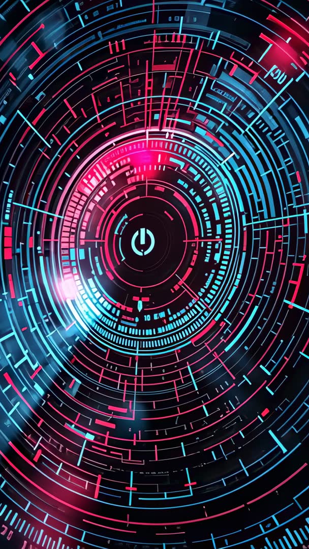 AI Generated Image. Vertical 9:16 motion clip featuring activating futuristic HUD interface with concentric neon rings and central pulsing power icon. Color palette combining electric cyan and magenta on deep black, creating high-contrast cyberpunk mood. Motion elements featuring spinning rings, rotating data segments, radial progress bars, flickering scan lines, and subtle lens flares for dynamic depth. Ideal for tech opener, app demo background, social story, vertical ad, conference loop, live VJ visuals, and broadcast stings. Editing suggestions: preparing seamless loop for endless playback, adding punchy electronic SFX and bass hit on power pulse, overlaying short headlines with bold sans-serif fonts, adjusting color balance toward brand tones, and trimming speed for slow reveal or rapid energizing cut. Delivery recommendations: exporting H.264 or ProRes at 1080x1920 or 4K vertical, providing transparent alpha version for layered HUD compositing, and supplying short loopable clips for social platforms and streaming overlays.