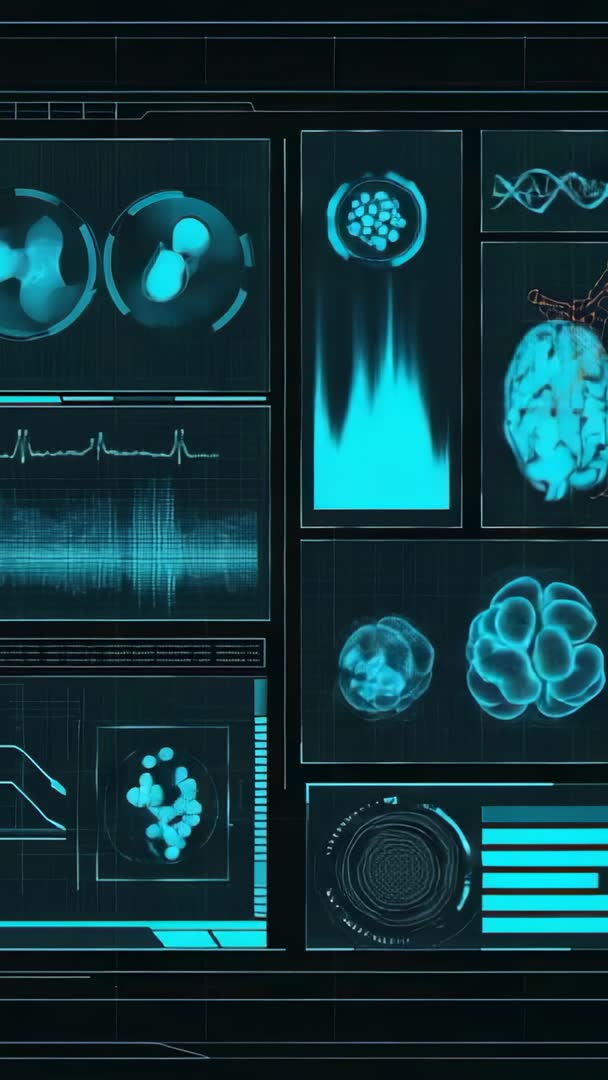 AI Generated Video. Vertical 9:16 video featuring activating lab console with rotating molecular models, pulsing waveform, DNA helix, and dynamic readouts in teal holographic HUD. Clip presenting futuristic biotech interface for diagnostic scanning, molecular analysis, and real-time data monitoring. Use for biotech startup pitch, medical technology demo, research presentation, clinical workflow animation, educational explainer, sci-fi trailer, or social media vertical ad. Works well as loopable background for websites, app onboarding screens, investor pitch decks, trade show displays, and video overlays. Color palette emphasizing teal and black for high-tech mood; ideal for titles, lower thirds, and data-driven visual storytelling. Include options for silent playback or layered ambient electronic soundtrack; use speed ramping or color grading to match brand. Suitable for mobile-first campaigns and vertical video platforms; export-ready for 9:16 aspect ratio.