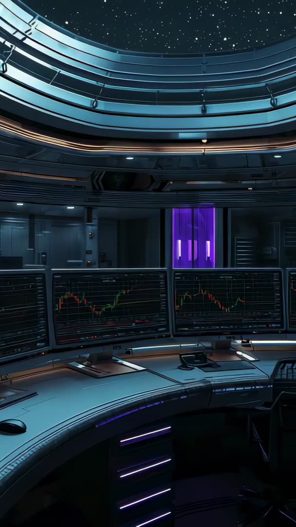 AI Generated Image. Clip showing multi-screen console displaying trading charts inside futuristic space station under starry sky. Curved workstation featuring neon and purple lighting, lit portal in background adding depth and sci-fi intrigue. Monitors presenting fluctuating candlestick charts, HUD overlays, and dynamic data visualization suiting finance, technology, or mission control themes. Ideal for broadcast openers, tech explainers, fintech promos, space documentaries, game trailers, app backgrounds, corporate presentations, and social vertical reels. Cropping for vertical mobile formats, layering subtle glitch effects and immersive sound design, and color grading toward cool blue and purple tones providing enhancement options. Clip working well as seamless loop for background visuals and title sequences.