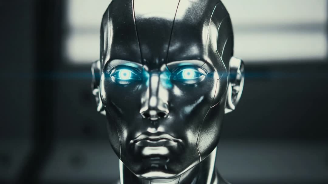 AI Generated Image. Showing polished chrome humanoid head with cyan glowing eyes activating sensors and undergoing calibration in high-tech lab. Close-up framing placing emphasis on reflective metal surfaces, facial contours, and intense eye light. Eye glow pulsing and horizontal scan beam moving across face, creating cinematic neon flare and atmospheric depth. Footage working well as loopable clip for website hero, opener for tech presentation, AI product demo, sci-fi trailer, or background for social posts. Pairing with voiceover about AI ethics, overlaying text about robotics innovation, or using as visual for cybersecurity and automation campaigns. Recommending slight bloom on eye highlights, low-key contrast grade, and gentle camera push for added drama. Motion variants including slow head tilt, brief zoom, and looping pupil pulse for seamless repeat.