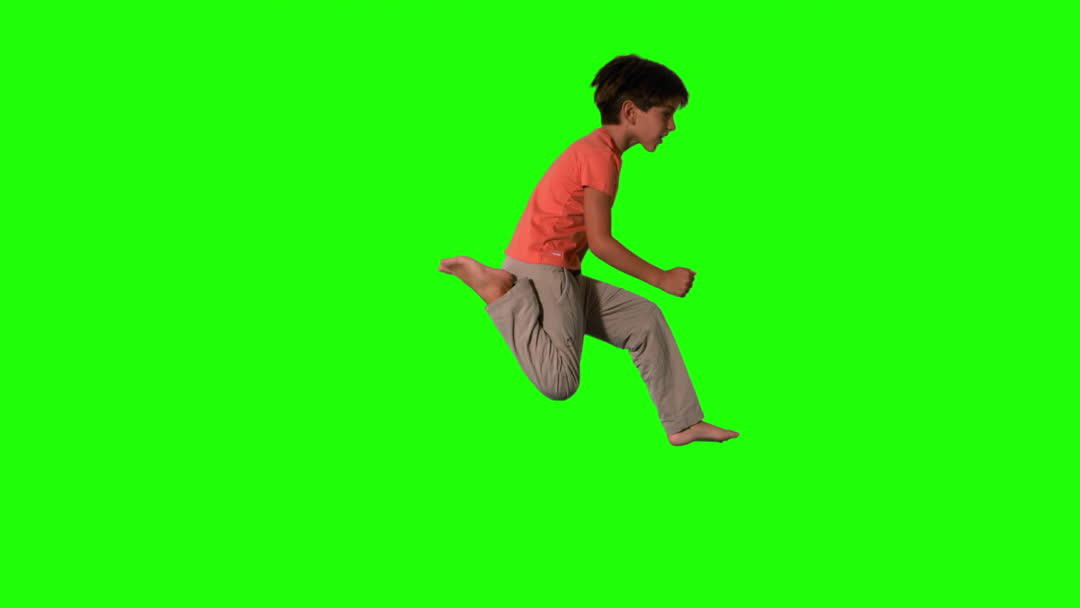 Bright scene of young boy in mid-air against green screen background, ideal for creative projects, digital backgrounds, promotions, educational materials involving energetic movement or play. Excellent for implementing playful, dynamic motion effects in videos or games.