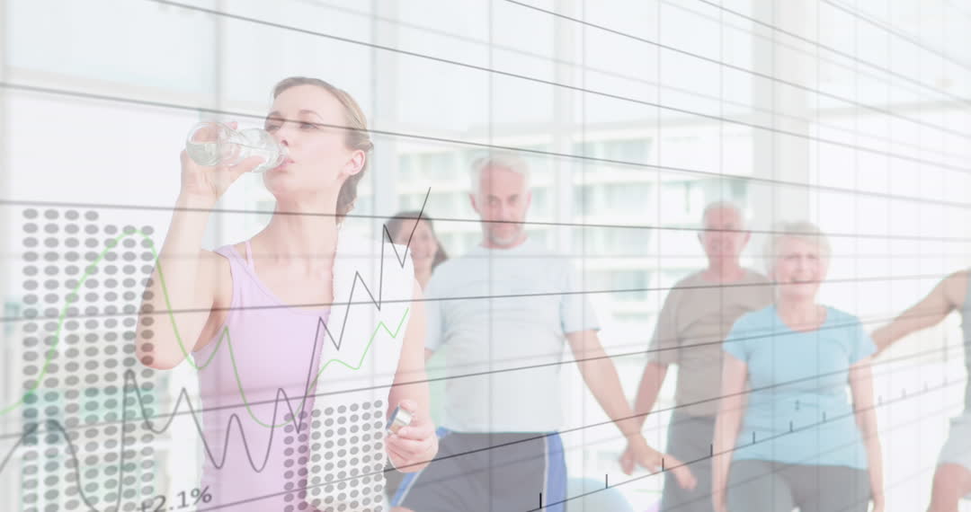 Illustrates integration of fitness and data analysis. A woman hydrating with seniors exercising, overlaid with graphs and analytics. Useful for topics on health trends, sports data technology, active aging, and innovation in wellness sectors. Ideal for articles or presentations on utilizing technology for health improvement and active lifestyle promotion.