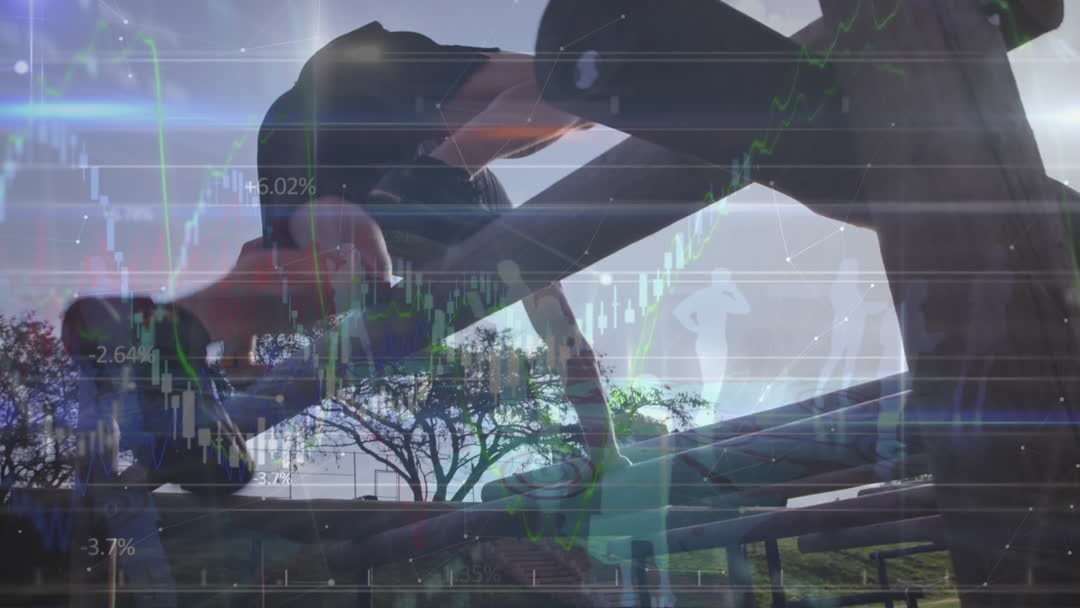 Dynamic blend of fitness and financial data visualization captures energy and motivation. Perfect for illustrating concepts of financial growth, lifestyle improvement, and economic commentary linked to active living.