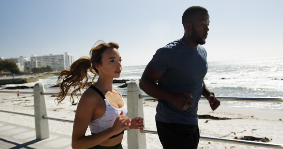 - Active Multicultural Couple Jogging Along Beach Promenade