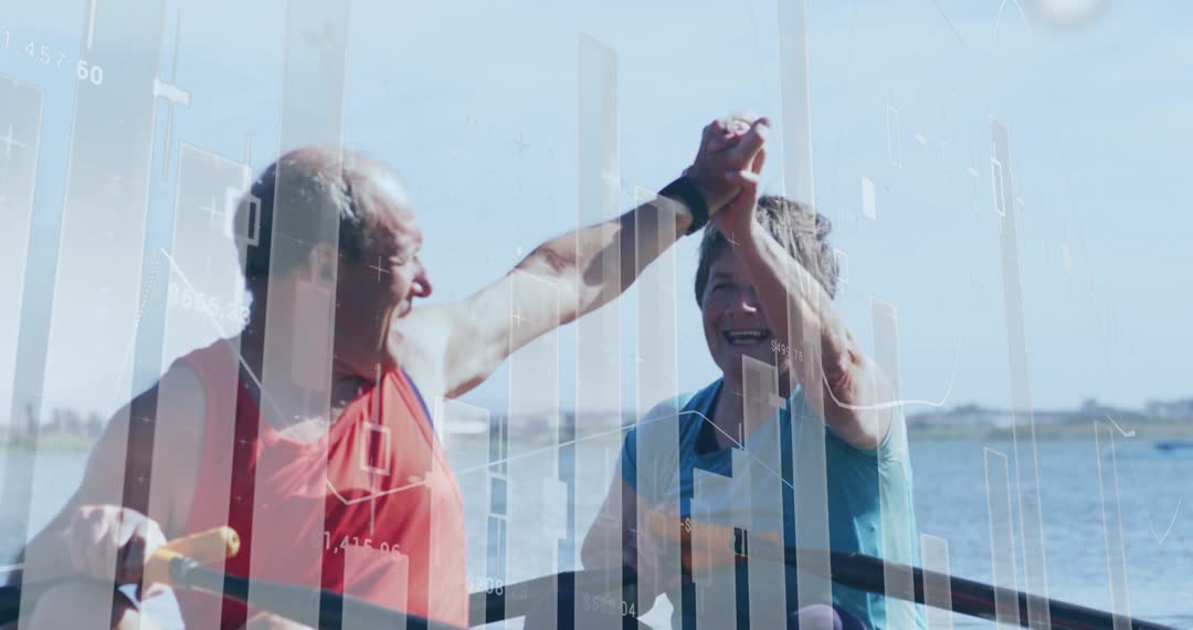 - Active Seniors Celebrating Kayak High-Five with Data Chart Overlay for Travel Marketing