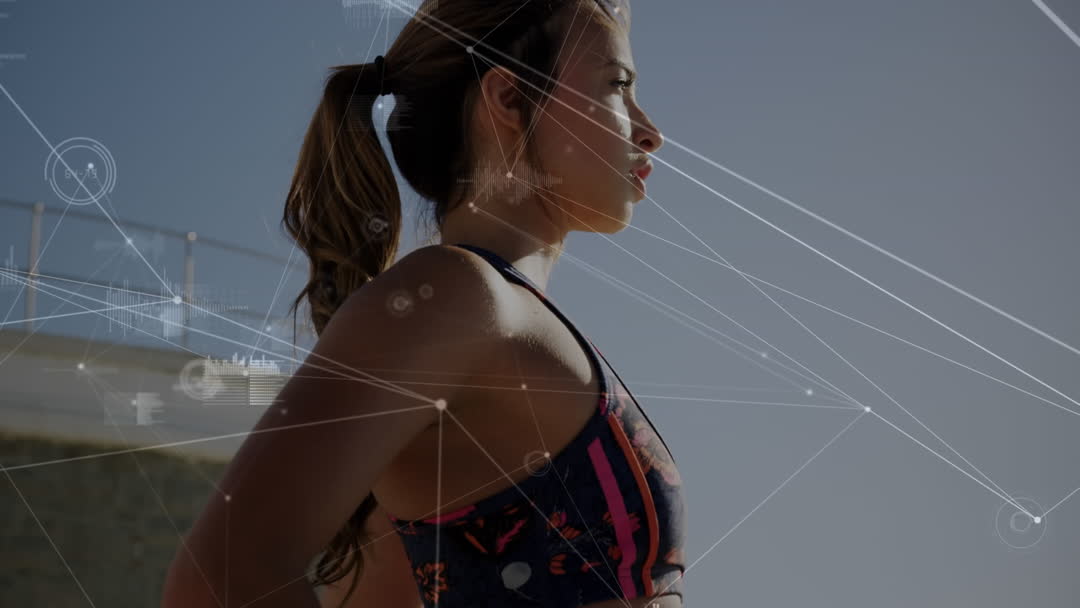This visual depicts an active woman exercing outdoors, interconnected with digital lines suggesting advanced technology and connectivity concepts. It is ideal for illustrating fitness technology, modern health methods, and integration of digital tools in active lifestyles.