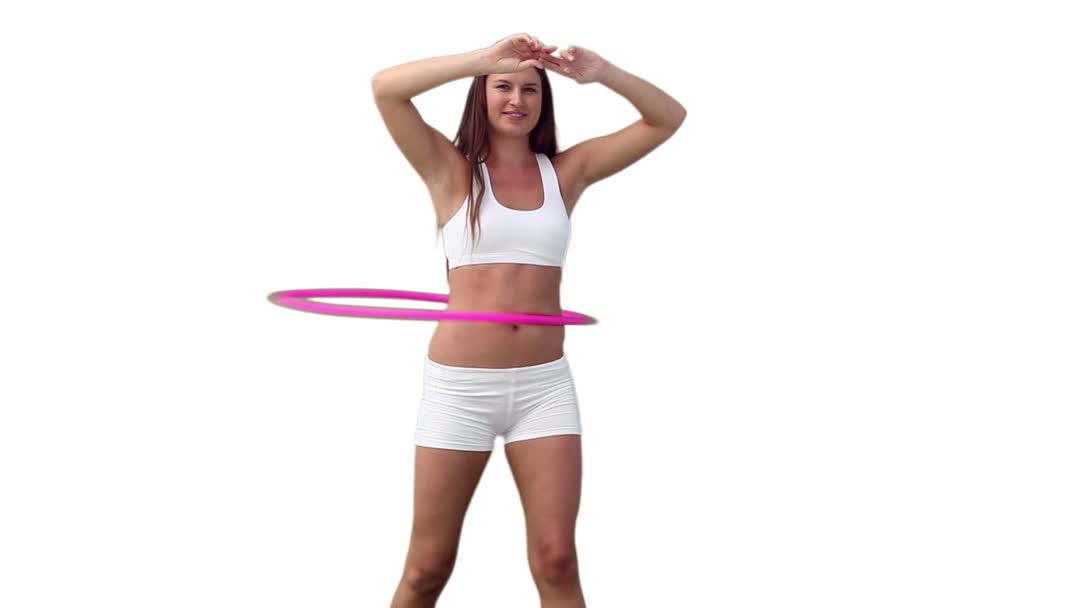 This video depicts a woman engaged in a fitness routine with a hula hoop against a plain white background. She wears a white training ensemble, highlighting her athletic build. This could be useful for fitness blogs, health guides, or exercise tutorial content where demonstrating engaging workouts is key.