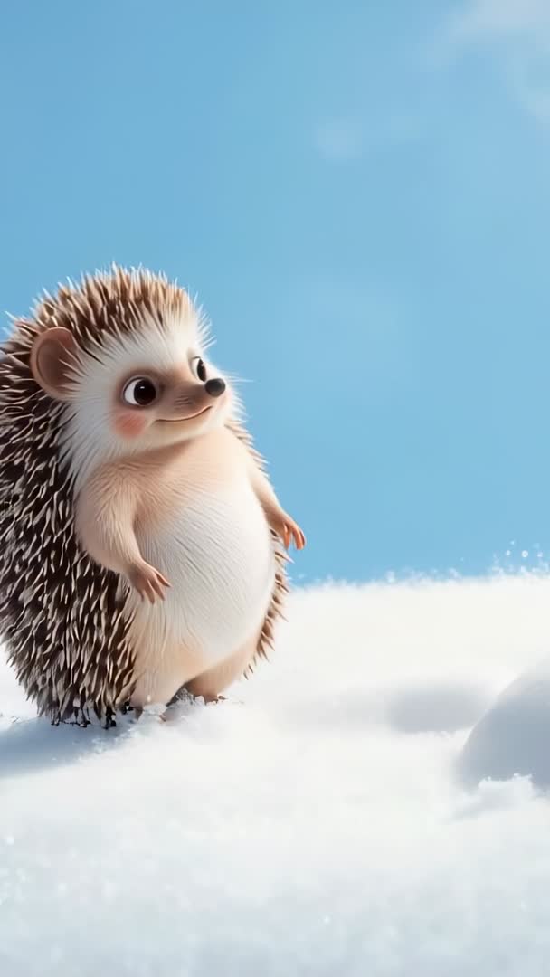 AI Generated Video. Vertical 3D animation showing adorable hedgehog clutching twig watching snowball drifting away across snowy ground under clear blue sky. Character presenting round expressive eyes, soft fur and detailed spines, creating whimsical heartwarming mood. Composition leaving generous copy space on right for text, logo or captions. Fitting children content, holiday greeting videos, social media shorts, mobile app intros, animated ads, nursery animations, storytelling segments, educational clips and loopable backgrounds. Visual style working well for family brands, toy promotions, seasonal campaigns and wellness messaging. Use by adding playful music, gentle sound effects and simple text overlay to enhance storytelling and call-to-action.