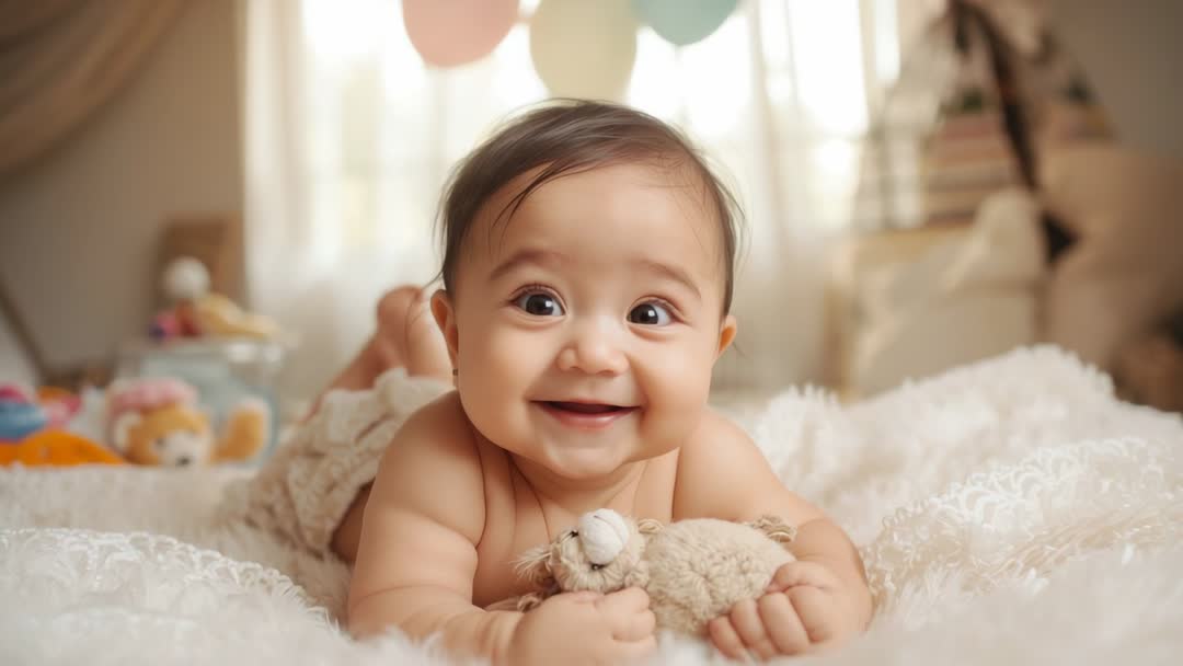 AI Generated Image. This video captures an adorable infant grasping a plush toy while lying tummy-time style. The bright backdrop with pastel balloons adds a cheerful ambiance, perfect for capturing the essence of joyful childhood moments. Ideal for promotional materials, parenting blogs, or advertisements related to baby products and nurseries.
