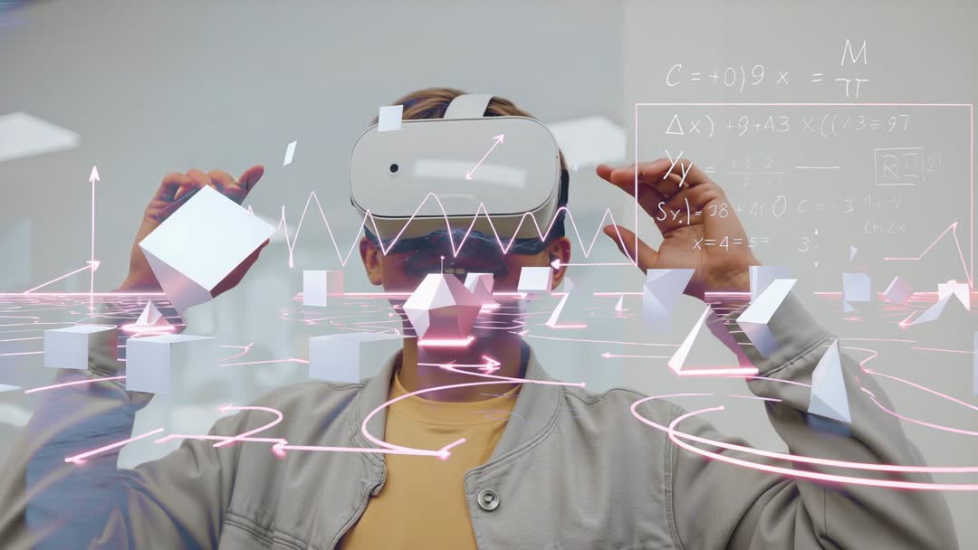 AI Generated Video. A man interacts with education and innovation derivatives through 3D rendered floating shapes while using virtual reality technology in a research lab environment. This scene can be useful for illustrating the concept of immersive tech experiences, future workplace simulations, or training modalities enhanced with virtual elements. Also useful for anyone promoting advancements in digital or educational technology or illustrating how arenas like research or learning then become further complimented with AI augmentation for mixed or augmented reality solutions in applied fields.
