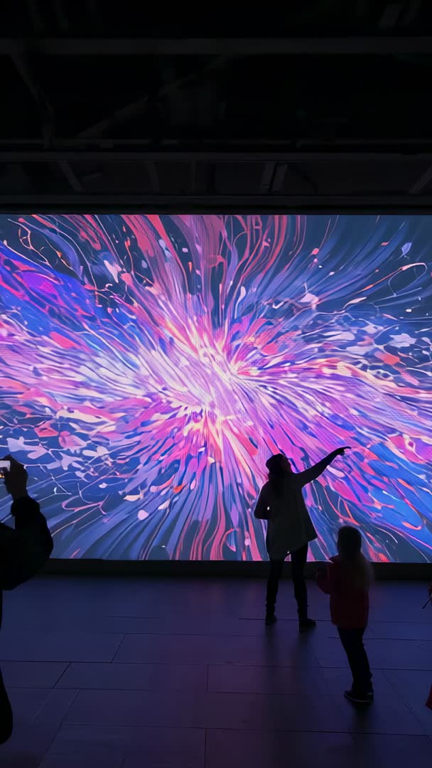 - Adult pointing at neon LED swirl installation, child watching, phone filming vertical video