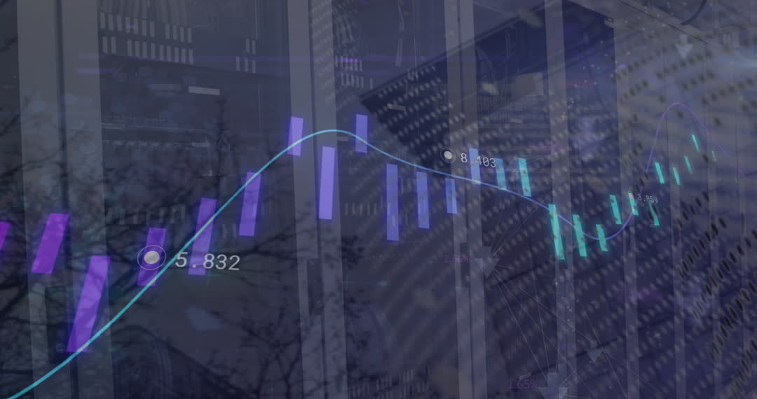 A digital representation of financial data processing overlaying an video of an empty server room. Ideal for use in content focusing on advanced analytics, data processing, technology in finance, global business strategies, or data storage solutions. Highlights the intersection of finance and technology using visual data representation.