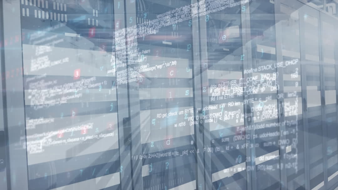 Dynamic animation depicting network servers in a professional tech environment with data code running across the screen. Ideal for use in presentations about cyber security, IT infrastructure, digital transformation, and global technology advancements. Useful for illustrating high-tech concepts for educational or marketing purposes.