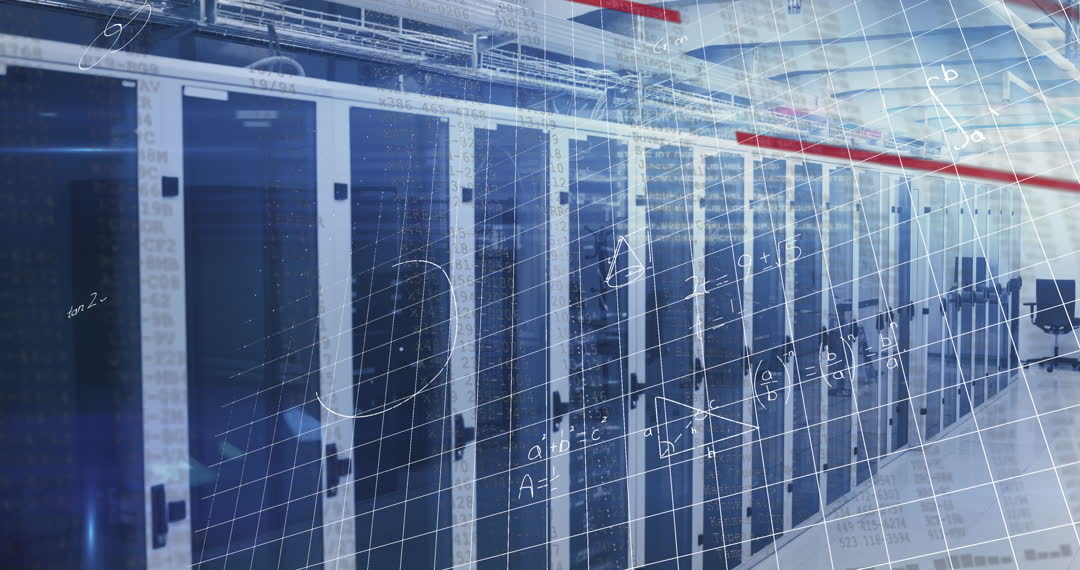 This dynamic overlay of mathematical equations on computer servers depicts the intricate process of global data communication and processing. Ideal for illustrating concepts in IT infrastructure, data science, and technological advancements. Useful in educational materials, videos on digital development, or as an explanatory visual in tech presentations.