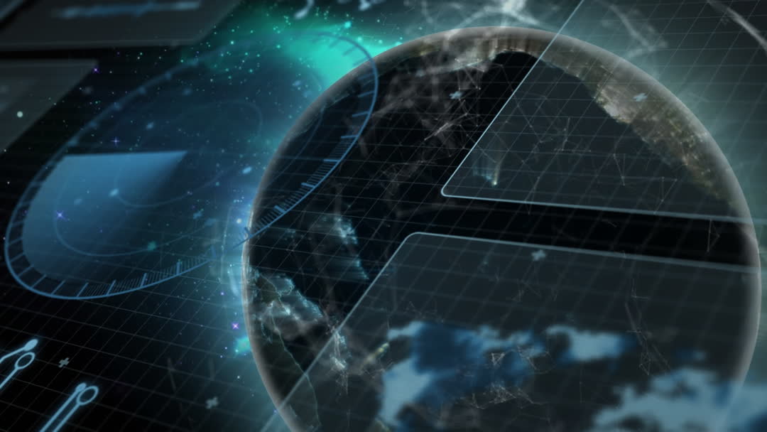 Advanced Digital Interface with Rotating Global Tech Elements Video