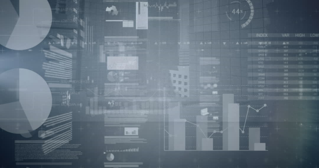 Digital interface exhibiting various financial charts and graphs on grey background displays complex data analysis concepts. Suitable for presentations, business websites, financial sector marketing, and analytical research projects.