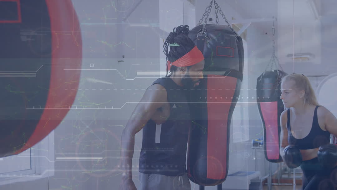 Young woman and a man are engaging in boxing training with punching bags in a gym environment. Overlay of technology graphics indicates integration of advanced data processing in the workout. Useful for articles or advertisements related to technological advancements in fitness, enhanced workout apps, or modern training equipment design. Ideal for promoting health innovations, sporting brands, or digital fitness tools.