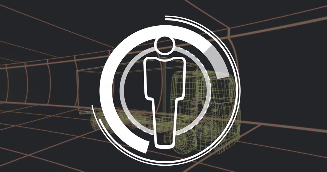 Depiction shows advanced interface and integration of human elements with automotive design through a floating human icon over a 3D grid and car model. Ideal for conveying themes related to future automotive technology, smart mobility solutions, human-machine interactions, and virtual engineering processes in presentations, publications, or digital media exploring advancements in vehicle design.