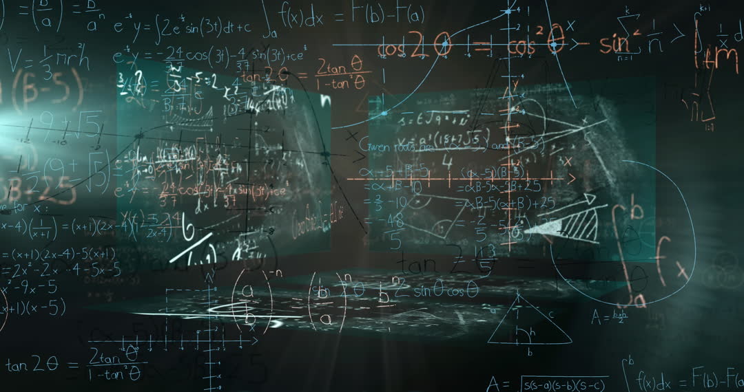 Visually engaging representation of complex mathematical equations and formulas. Ideal for illustrating concepts in mathematics, physics, or science education. Useful for educational videos, presentations, or digital platforms focusing on learning enhancement and academic instruction.