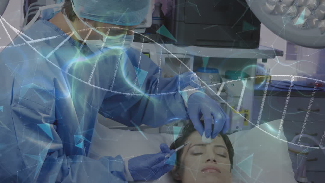 Medical experts perform surgery with digital interfaces demonstrating futuristic technology in healthcare. Ideal for showing advancements in biotechnology and how digital networks enhance precision in medical procedures.