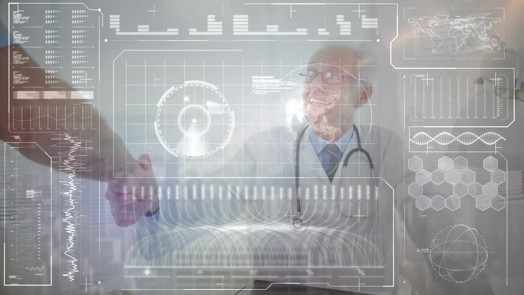 Doctor surrounded by advanced digital technology and data analytics. Reflecting modern medical practices and innovation in healthcare. Suitable for illustrating articles on healthcare technology, advancements in medicine, and global medical research trends.