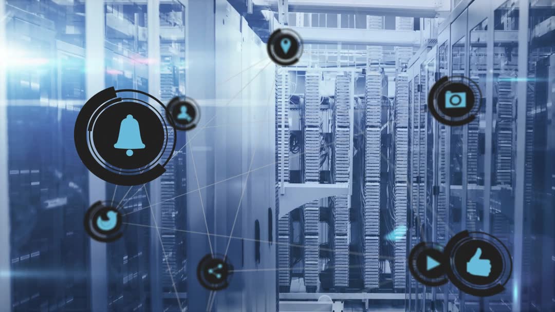 Visual depicting server aisle with overlay of digital icons interconnected by network lines, illustrating modern technological advancement and data exchange. Suitable for illustrating themes of cybersecurity, cloud computing, IT infrastructure, and digital connectivity. Useful for articles and marketing campaigns focused on tech innovation, network architecture, and data management.