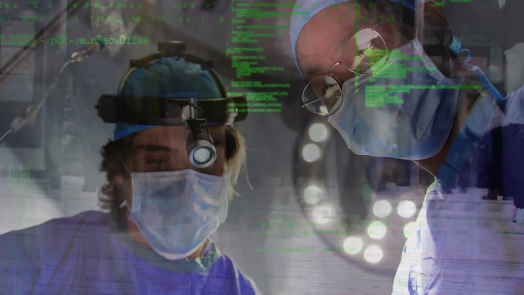 Image depicts surgeons in an operating room with an overlay of digital codes, highlighting modern technology in healthcare. This could be used for medical technology presentations, healthcare promo materials, or articles on advanced surgical techniques.