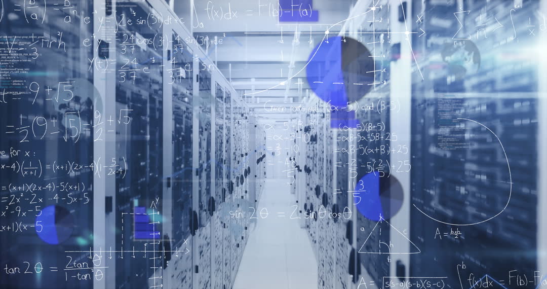 This visual captures the sleek interior of a modern server room, supplemented by dynamic animations of mathematical formulas and digital graphics, representing high-tech computing and global connectivity. Ideal for illustrating concepts of network security, data management solutions, or digital infrastructure advancements in presentations, technological advertisements, or educational resources.