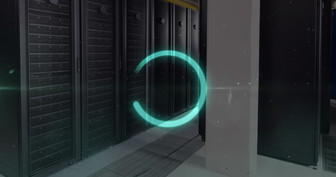 Futuristic server room with a glowing digital loading animation in the foreground, indicating data processing or system updates. Ideal for illustrating concepts related to technology, IT infrastructure, and digital interfaces. Useful for advertising advanced data center services, showcasing cyber security features, or as a background for presentations on technology advancements.