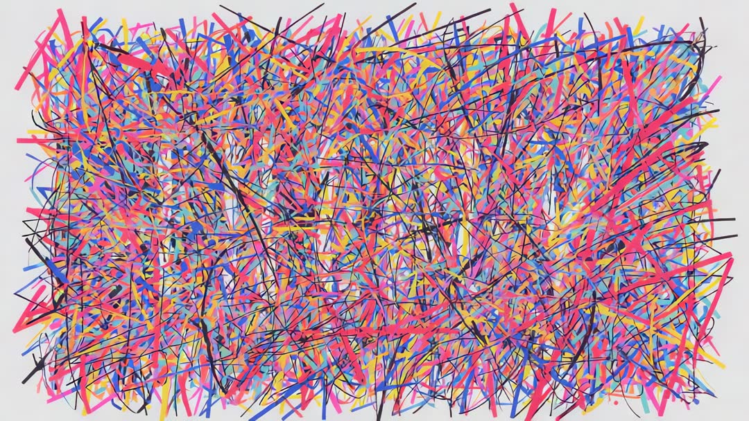 AI Generated Video. Frame from evolving abstract video showing rectangular panel filling with dense neon strokes on white backdrop. Bright pink, blue, yellow and black lines layering into chaotic overlapping grid, creating vibrant textured field with visible white margins. Motion suggesting hand-drawn or algorithmic scribble, offering strong sense of energy and rhythm. Working well for music video visuals, motion graphics backgrounds, website hero loops, social media animated posts, stage projection and VJ sets. Useful for creative advertising, modern art installations, textile patterns, packaging mockups and editorial design. Provide ready source for creating seamless loops, transition overlays, color grading tests and texture packs.