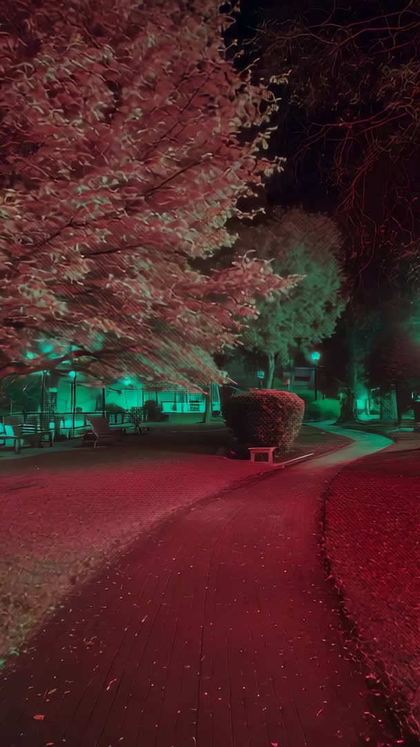 AI Generated Image. Video showing camera advancing along curved brick paver walkway at night, lit by teal accent lights and warm red foreground wash. Motion blur in tree canopy adding dreamy cinematic vibe while trimmed shrub moves into close foreground. Composition using strong leading lines and layered depth for immersive push-in shot. Suitable for social media vertical ads, Instagram Reels, TikTok background clips, music video interludes, travel and lifestyle openers, landscape lighting showcases, urban planning b-roll, mood-driven brand promos, meditation and ambient channels. Editorial and commercial uses including real estate night lighting features and outdoor furniture or public space design presentations. Production tips: apply color grading to enhance teal and red contrast, add slow ambient soundtrack and subtle riser for tension, keep overlay text within top and bottom safe areas, render as 9:16 vertical for mobile platforms, consider loop trimming for seamless background use.
