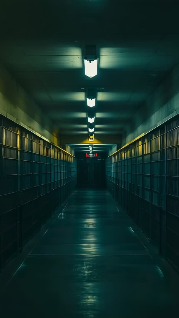 AI Generated Image. Showing long central corridor with metal bars, gated passage, overhead fluorescent lights, and illuminated exit sign. Vertical 9:16 footage featuring slow forward motion and strong vanishing point, creating cinematic tension and suspense. Useful for creating thriller trailers, crime or prison documentary scenes, security and surveillance concepts, urban exploration segments, architectural studies, or music video backgrounds. Suggesting color grading toward teal and amber contrast, adding film grain and subtle camera shake for heightened drama. Including safe space for text overlay or title card near far end of frame due to clear negative space. Deliverable for social media reels, mobile ads, stock b-roll, title sequences, or mood-driven promotional content.