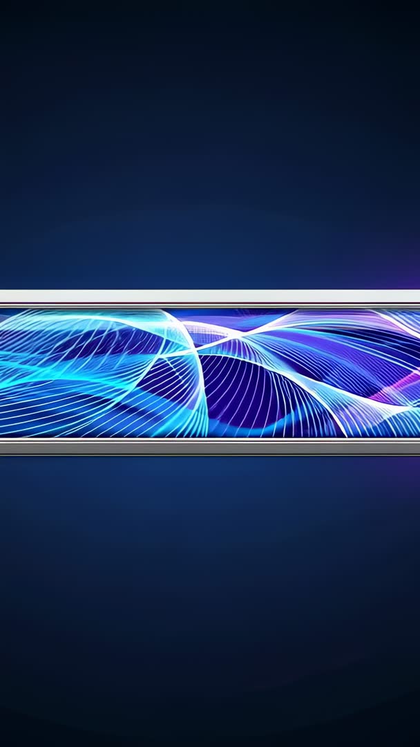 AI Generated Video. Showing slim horizontal display panel animating flowing blue and purple waveforms across narrow vertical frame. Featuring metallic trim, deep navy studio backdrop, and soft neon glow with gradient shimmer and subtle ripple motion. Looping smooth motion for continuous playback in vertical format. Providing high-contrast area for overlay text at top and bottom while offering clean negative space for branding and captions. Ideal for mobile ads, social stories, vertical signage, app intros, product launch promos, and event visuals. Delivering modern futuristic aesthetic suitable for tech campaigns, UI demos, livestream backgrounds, and motion graphic templates. Allowing easy color grading and text insertion for quick customization.