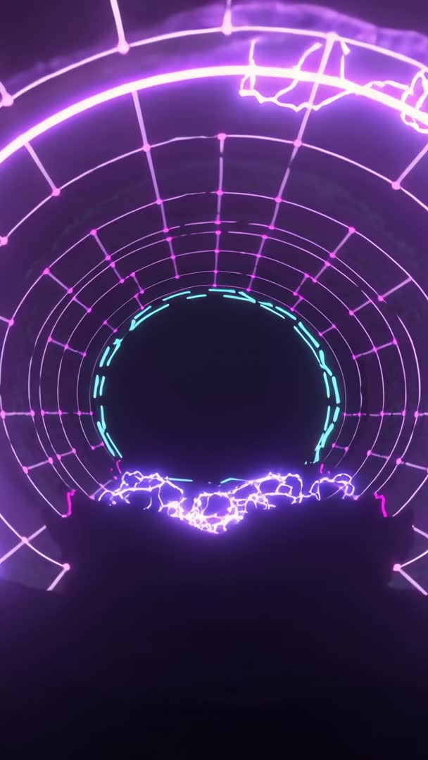 AI Generated Image. Camera advancing into neon portal, revealing concentric magenta rings, cyan dashed ring, and electric purple arcs tracing wireframe gridwork. Composition using vertical 9:16 frame, optimized for mobile viewing and social feed delivery. Color palette featuring magenta, purple, cyan against deep black core, creating strong focal contrast and immersive depth. Motion delivering pulsating glow, subtle parallax, and forward momentum ideal for transitions and dramatic reveals. Looping friendly design allowing seamless repeat for continuous playback. Usage ideas: using as background for music videos, Instagram Reels, TikTok clips, smartphone ads, app intros, title sequences, VJ visuals, and sci?fi trailers; pairing with electronic or ambient soundscapes; applying speed ramps, overlays, or color grades to match brand. Technical suggestions: exporting as MP4 H.264 or ProRes, including loop markers for editors, and providing short trimmed loops for mobile-first projects.