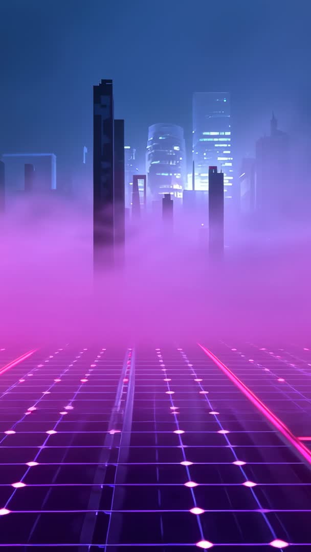 AI Generated Video. Vertical video showing neon grid advancing into magenta fog toward glowing blue skyline. Camera pulling forward along luminous lattice, revealing towering skyscrapers emerging from mist. Color palette blending deep blue and vibrant magenta, creating retrofuturistic synthwave mood. Composition working well for background loops, title intros, social reels, music videos, tech promos. Ideal for app splash screens, game trailers, cyberpunk scenes, futuristic brand spots, nightlife event promos. Editors customizing color, speed, and motion blur for brand alignment and cinematic pacing. Loopable cadence allowing seamless repetition for long formats.