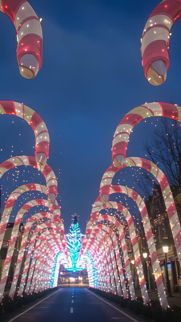 AI Generated Image. Vertical footage showing camera advancing down urban road lined with oversized candy-cane arches wrapped in red and white lights. Arches forming luminous tunnel leading toward vibrant blue-lit conifer at avenue end. Twilight sky providing deep blue contrast while street lamps and floating sparkles adding magical atmosphere. Symmetrical framing and strong leading lines creating immersive perspective and cinematic depth. Motion forward providing natural hero shot for storytelling and brand intros. Ideal for holiday promotions, seasonal social media reels and stories, event openers, retail window displays, festive adverts, digital signage, and travel or city tourism features. Working well as background for greeting cards with animated text overlay, countdowns, and playlist visuals. Recommendation: add upbeat festive music, subtle glow and color grading to enhance red and blue contrast, and place titles within upper third to avoid overlaying arches. Clip trimming at head and tail creating seamless loop for repeating displays. Delivering mobile-first vertical format suited for Instagram Reels, TikTok, Snapchat, and full-screen digital campaigns.