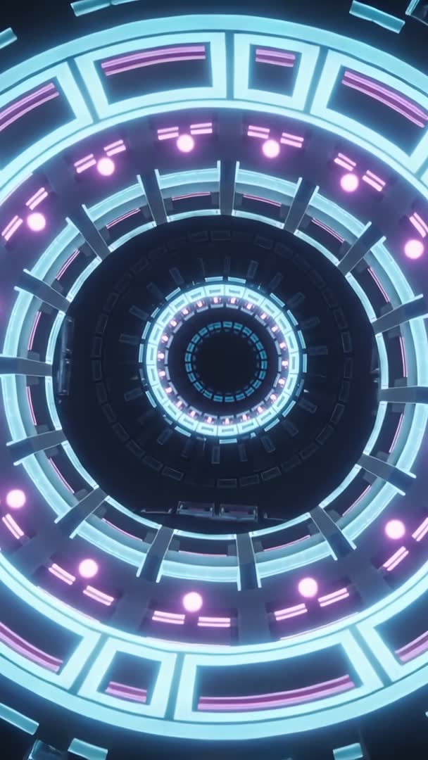 AI Generated Image. Vertical loop video showing advancing camera moving through concentric neon rings inside cylindrical shaft with pulsing magenta nodes and glowing cyan illumination. Futuristic cybernetic tunnel creating immersive tech atmosphere. Ideal for use in tech promos, sci-fi trailers, UI backgrounds, event visuals, music videos, product launches. Seamless looping motion providing reusable background for motion design, broadcast intros, app hero screens. Color palette featuring high-contrast cyan and magenta for bold neon aesthetic. Vertical format optimizing for Instagram Reels, TikTok, Snapchat, mobile ads, vertical displays. Editing tips include blending with electronic soundtrack, adding motion blur for speed, layering typography with neon accents, adjusting color grading for stronger cyan-magenta contrast. Usage contexts include tech brand campaigns, VR and AR demos, futuristic title sequences, nightclub visuals, immersive installations.