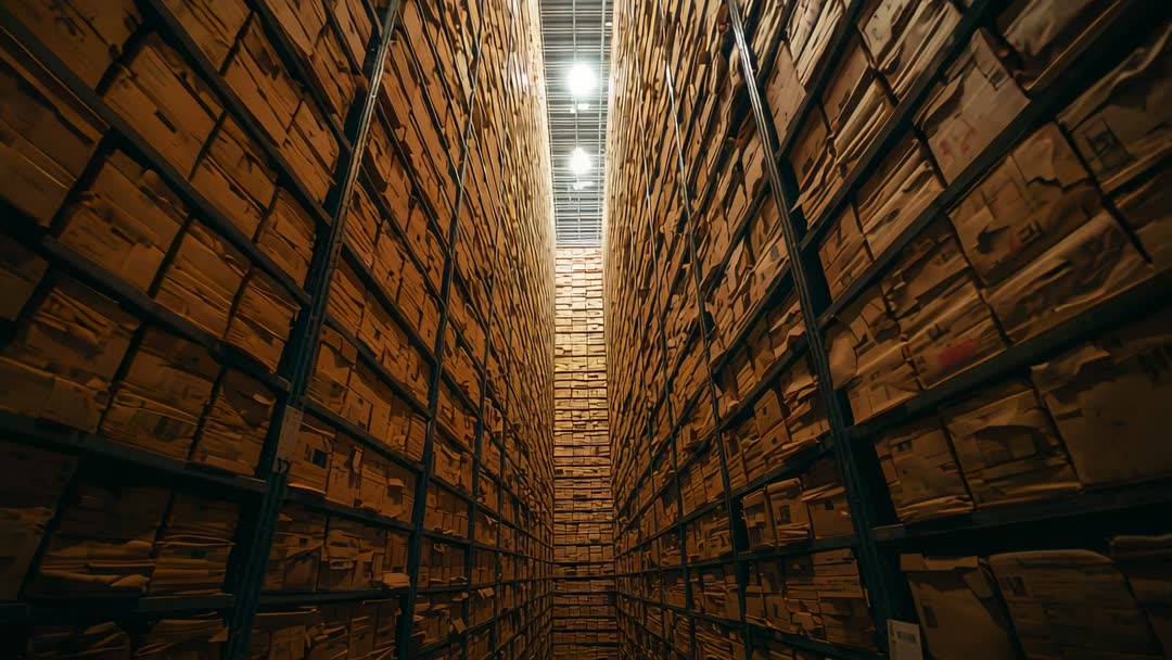 AI Generated Image. Video capturing sense of scale and efficiency in a vast warehouse environment as camera moves forward and tilts upward through shelves stacked high with boxes under industrial lights. This visual is perfect for content creators looking to illustrate the scale of logistics operations, discussions on supply chain management, or showcasing industrial storage solutions.