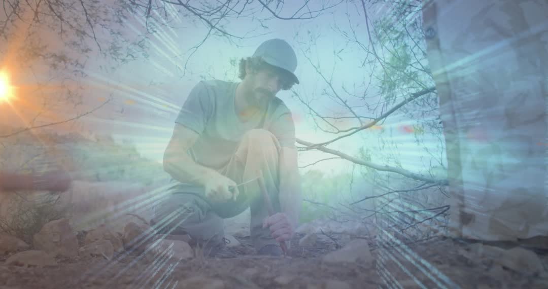 Depicting a person kneeling and using a rock hammer and chisel on rocky ground, enhanced by vibrant light ray animations. Perfect for use in educational materials about geological exploration, rugged outdoor adventures, or promotional content for lessons on nature and excavation activities.
