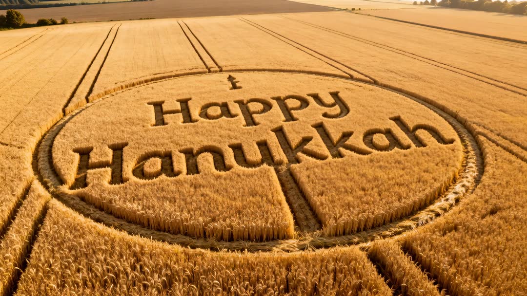 AI Generated Image. Drone descending over golden wheat field, revealing precision-carved Happy Hanukkah lettering and single candle motif within circular crop formation. Warm sunset light casting long shadows, enhancing texture of wheat and tracing tractor tracks that lead viewer eye toward central greeting. Camera slowly pulling back, offering wide panoramic reveal of surrounding farmland and horizon. Visual mood combining rustic agriculture with festive holiday message, creating striking contrast between natural landscape and bold typographic crop art. Usage ideas: Suited for holiday greeting videos, seasonal advertising, website hero banners, social media reels, email campaigns, broadcast idents, event openers. Working well for Jewish community announcements, synagogue promotions, agribusiness seasonal campaigns, travel and rural tourism pieces, festival of lights celebrations. Providing loopable aerial clip for background motion in virtual events, digital signage, gift card animations. Technical notes: Offering stable long shot with gentle pan and steady gimbal movement, warm color grade, low sun shadows enhancing depth, high contrast making carved letters highly legible from altitude.