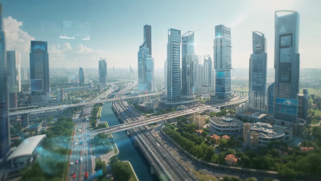 AI Generated Image. Gliding aerial drone dolly capturing towering glass skyscrapers clustered around multilane highway interchange and canal, featuring subtle holographic HUD overlays and lens flare. Soft tilt-shift focus and motion blur highlighting traffic flow and layered urban infrastructure. Emphasizing smart city, transportation, real estate development, and futuristic architecture themes. Serving corporate tech presentations, urban planning videos, real estate investment promos, sci-fi establishing shots, and website hero backgrounds. Usage suggestions: looping 8-12 second segment for background motion, color grading toward cool blue tones for high-tech look, adding subtle ambient electronic soundtrack and lower-third text for messaging, cropping for vertical social formats, and exporting at high bitrate to preserve building detail.