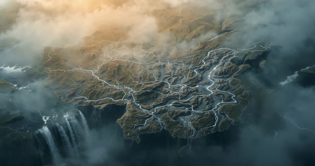 AI Generated Image. A fantasy-inspired aerial view captures glowing waterways tracing through a floating plateau enshrouded in clouds. Sunlight filters through, energizing the veins beneath and creating a mystical effect. A waterfall cascades dramatically, blending reality with fantasy. This video is ideal for digital art projects, creative storytelling, or use as a science fiction narrative visualization.