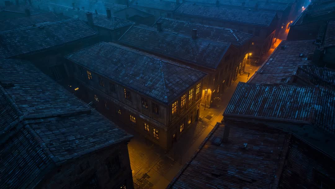 - Aerial Glimpse of Nightime Over Old Town's Tiled Rooftops