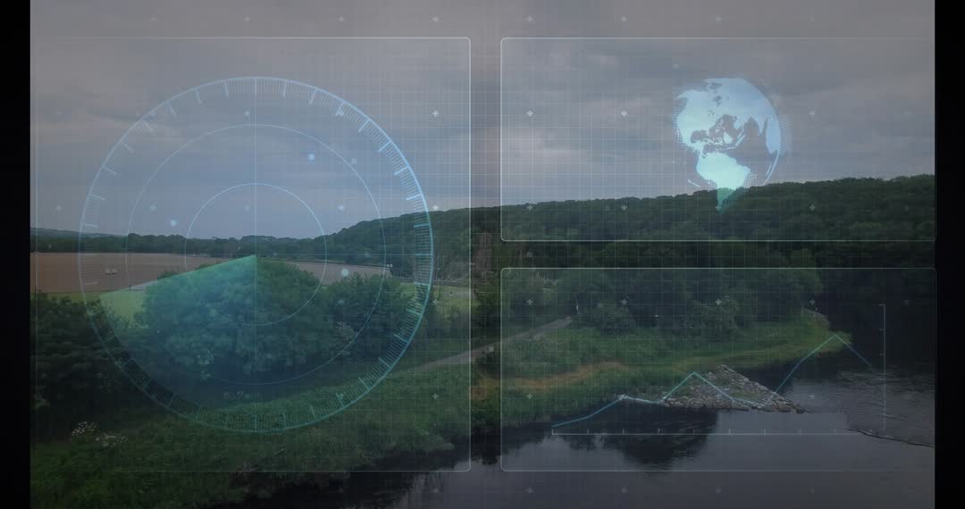 Aerial Riverbank HUD Monitoring with Radar Sweep, Pulsing Globe and Dynamic Data Chart Video